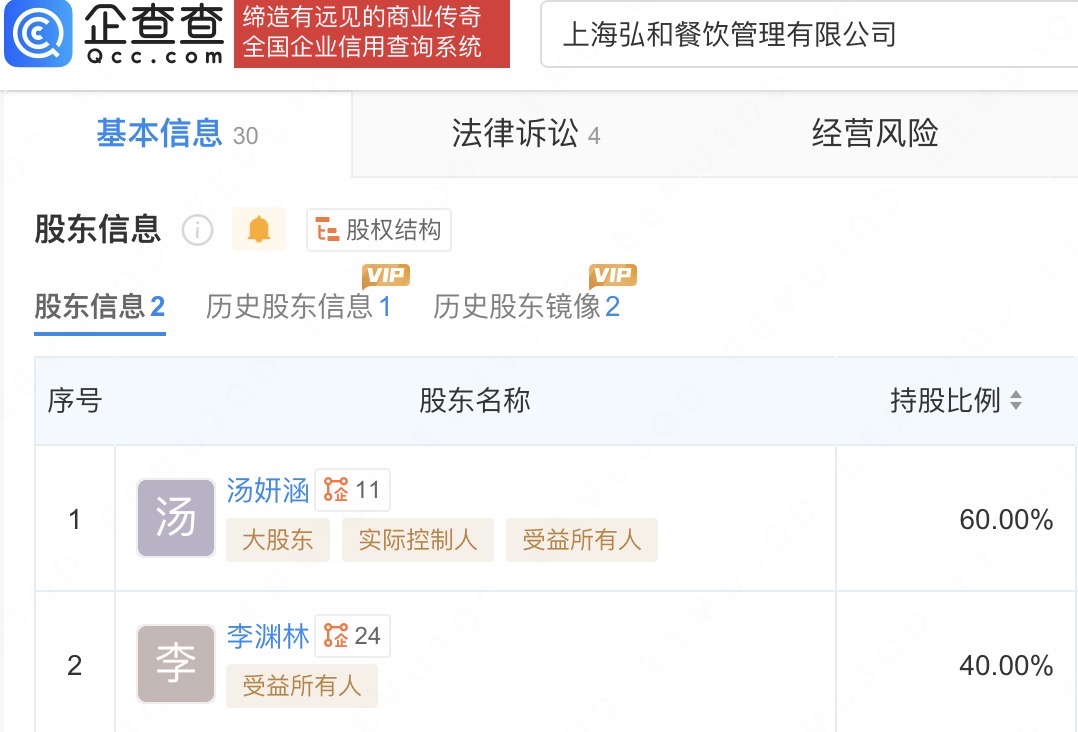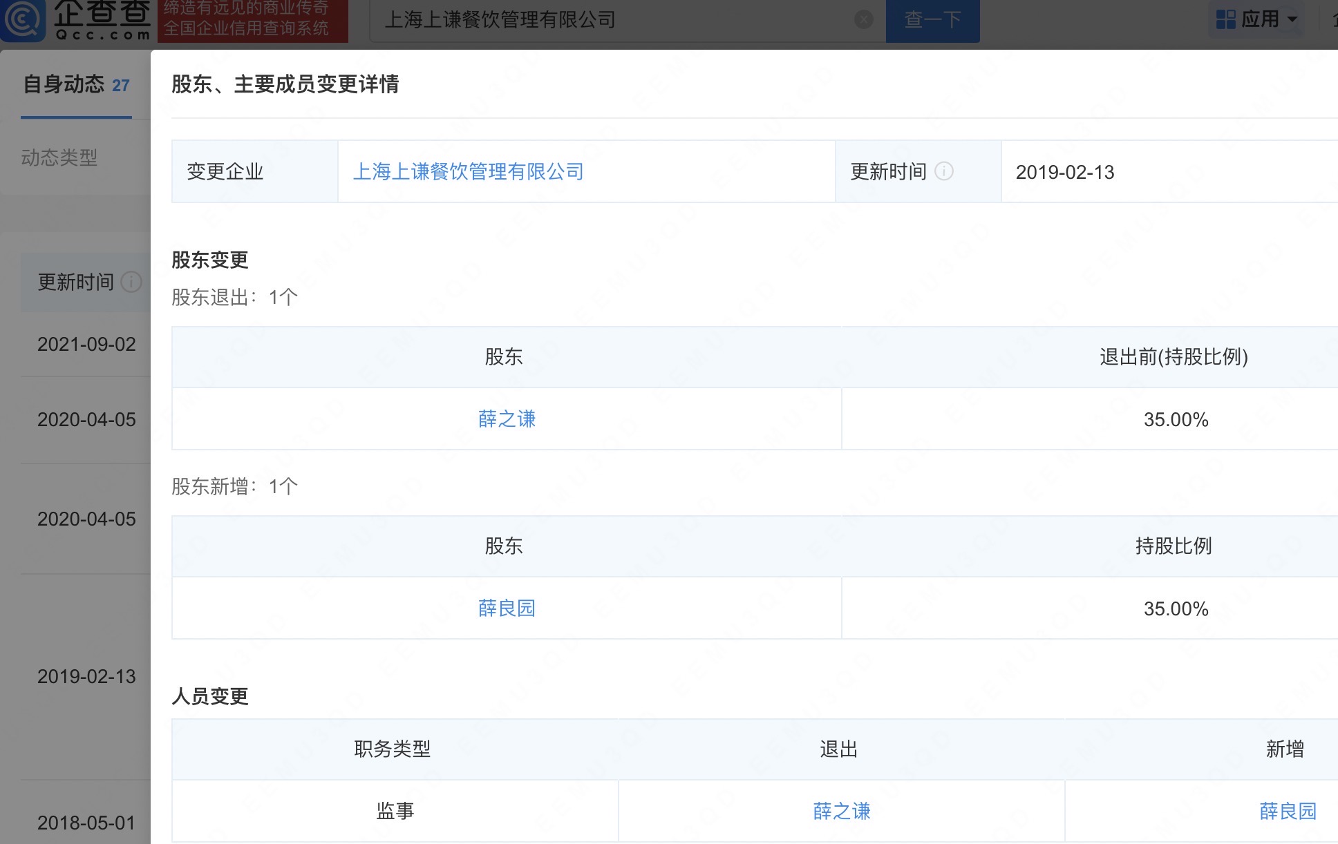 近日,由明星薛之谦创立的上上谦火锅发布一则闭店通知,称因租约到期,广州店将于12月15日关闭。此后,上上谦全国门店仅剩上海店仍在营业。上海上谦餐饮管理有限公司成立于2012年9688策略宝,法定代表人为李渊林,经营范围为餐饮服务、餐饮企业管理,由李渊林、薛良园共同持股。值得注意的是,该公司已于2021年9月注销。变更记录显示,2019年2月,薛之谦退出该公司股东,其父薛良园入股。此外,上上谦火锅上海店关联公司上海弘和餐饮管理有限公司成立于2019年,法定代表人为李渊林,由汤妍涵、李渊林共同持股,该公司目前为存续状态。
