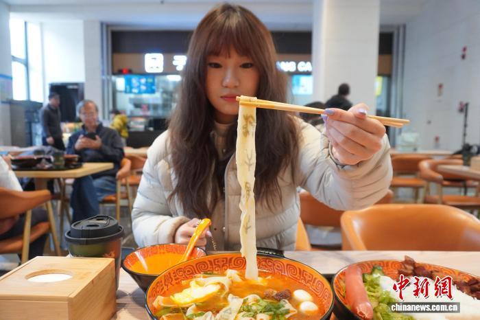 餐厅内,大学生游客薛冰点了一碗有“上岸成功”字样的“甲骨文面条”,她夹起面条拍照分享至朋友圈一气呵成,“这面条上的字吉利又喜庆”。
